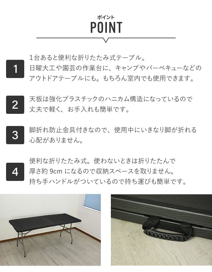 この作業テーブルを使って、あなたもスムーズな作業ができるはず。軽量なので、持ち運びも楽々。日曜大工や園芸の作業台、キャンプやバーベキューなどのアウトドアテーブルにもオススメ。