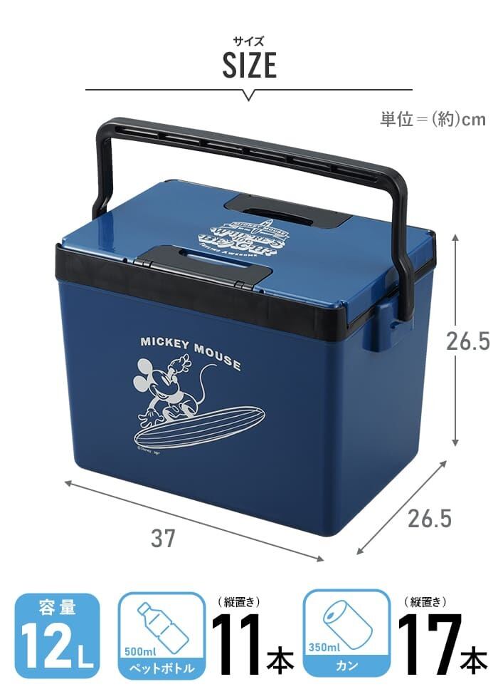 ミッキーマウスの可愛いデザインが施されたクーラーボックス、「UMI BL」。コンパクトなサイズでありながら、十分な収納スペースを確保し、お気に入りの飲み物やおやつを冷やして持ち運ぶことができます。蓋にもミッキーの耳がついたデザインがまるでアドベンチャーへと誘うようです。